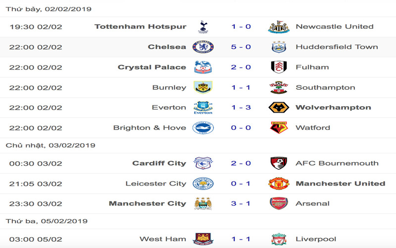 Hiểu rõ điều đó, chúng tôi cập nhật kết quả trực tuyến của toàn bộ các trận đấu thuộc Ngoại hạng Anh một cách nhanh chóng và đầy đủ. Ngay sau khi tiếng còi mãn cuộc vang lên, kết quả cùng các thông số quan trọng sẽ được hiển thị trên hệ thống. Đặc biệt, các trận đấu có sự góp mặt của những đội bóng lớn luôn được ưu tiên cập nhật sớm, giúp người hâm mộ dễ dàng theo dõi diễn biến mùa giải.